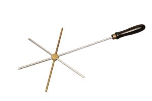 This apparatus demonstrates how five different metals (aluminum, brass, copper, nickel, and steel) conduct heat. The five rods are heated over a flame simultaneously, and students gauge what metal conducts heat best by observing how fast the wax at the tip of each rod melts.