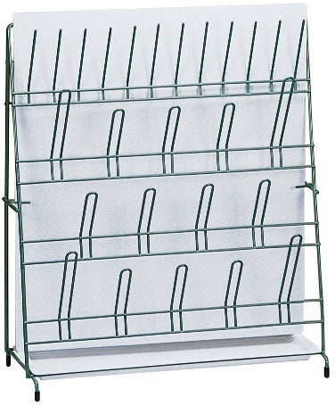 Vinyl-coated, steel-wire drying rack for test tubes, vials, flasks, cylinders, beakers and other laboratory glassware. Rack can be used standing up, lying down or mounted to the wall. Incorporated drain pan design keeps your counter dry. Choose small capacity rack to hold 26 pieces of glassware, or the large capacity rack to hold 90 pieces of glassware. Dimensions are 47 x 18.4 x 48.3cm (18.5 x 7.25 x 19 inches).