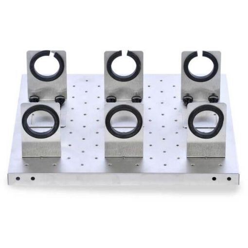Flask clamps are available in both stainless steel or PVC. All platforms are available in stainless steel. Rubber mat included with culture platforms, adjustable platforms and large vessel carriers.